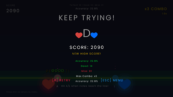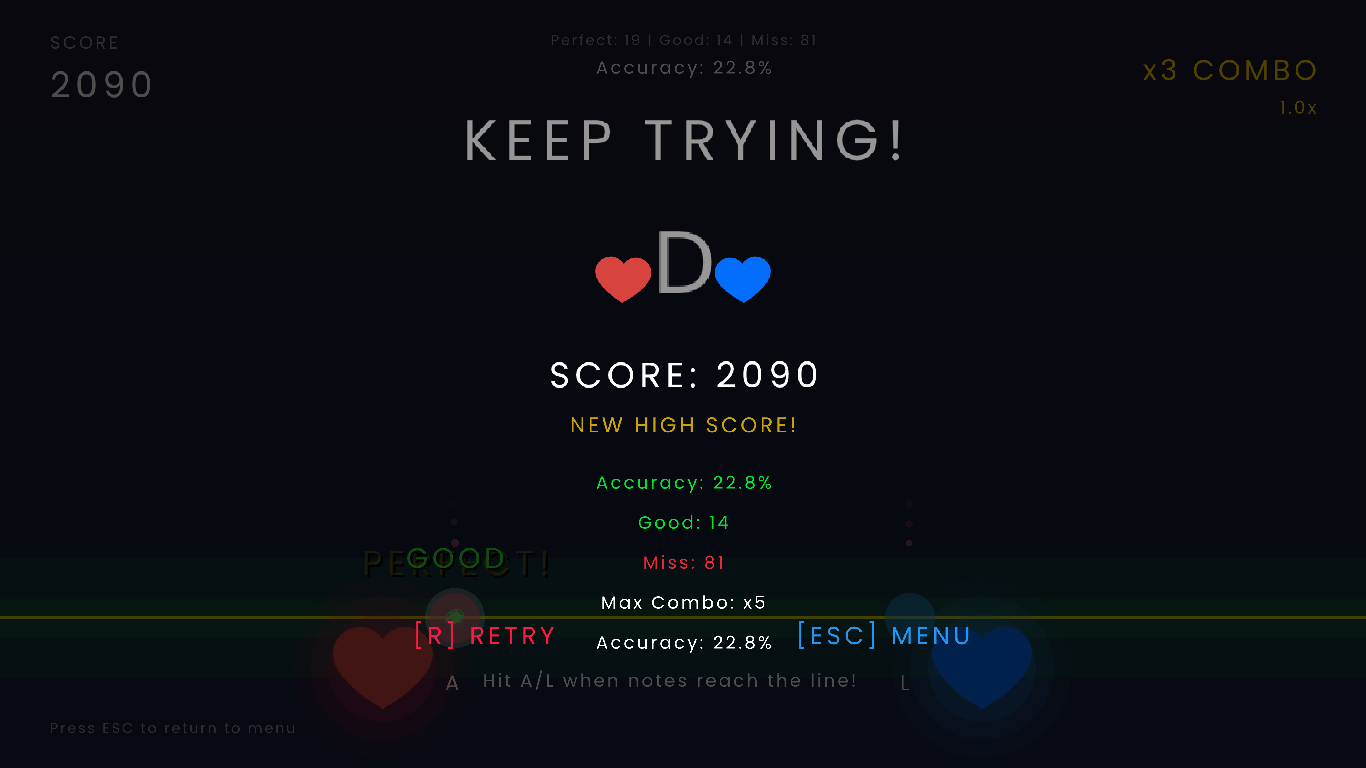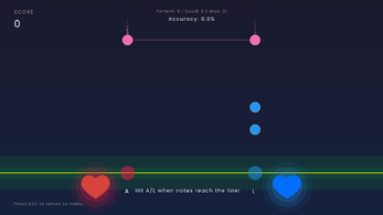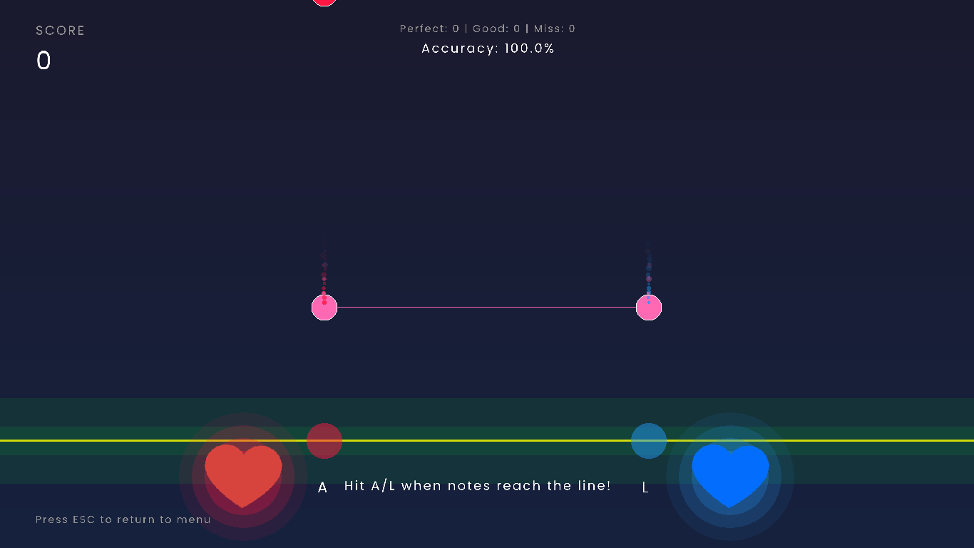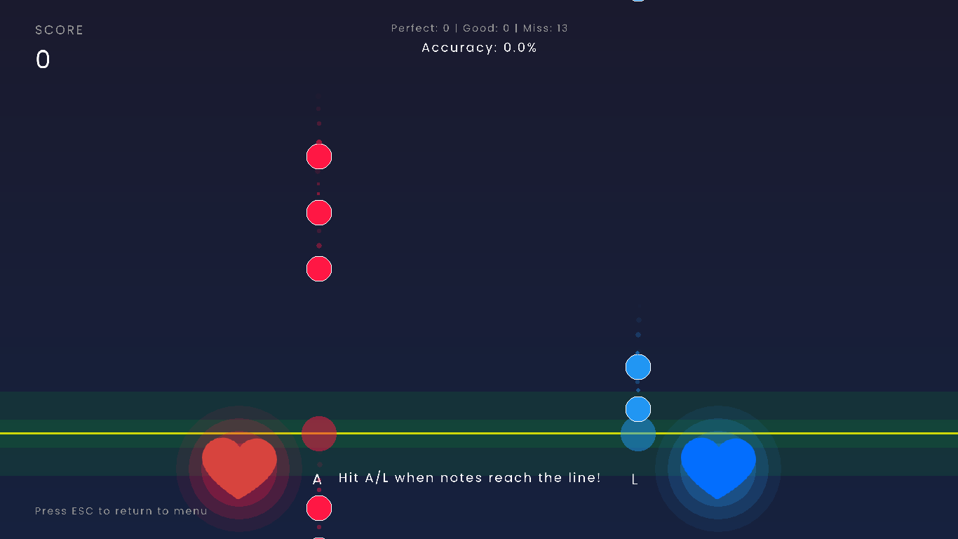 Le jeu se présente sous la forme de deux pistes verticales. À gauche, le Cœur Rouge. À droite, le Cœur Bleu. Des notes musicales descendent le long de chaque piste. Votre objectif est simple :